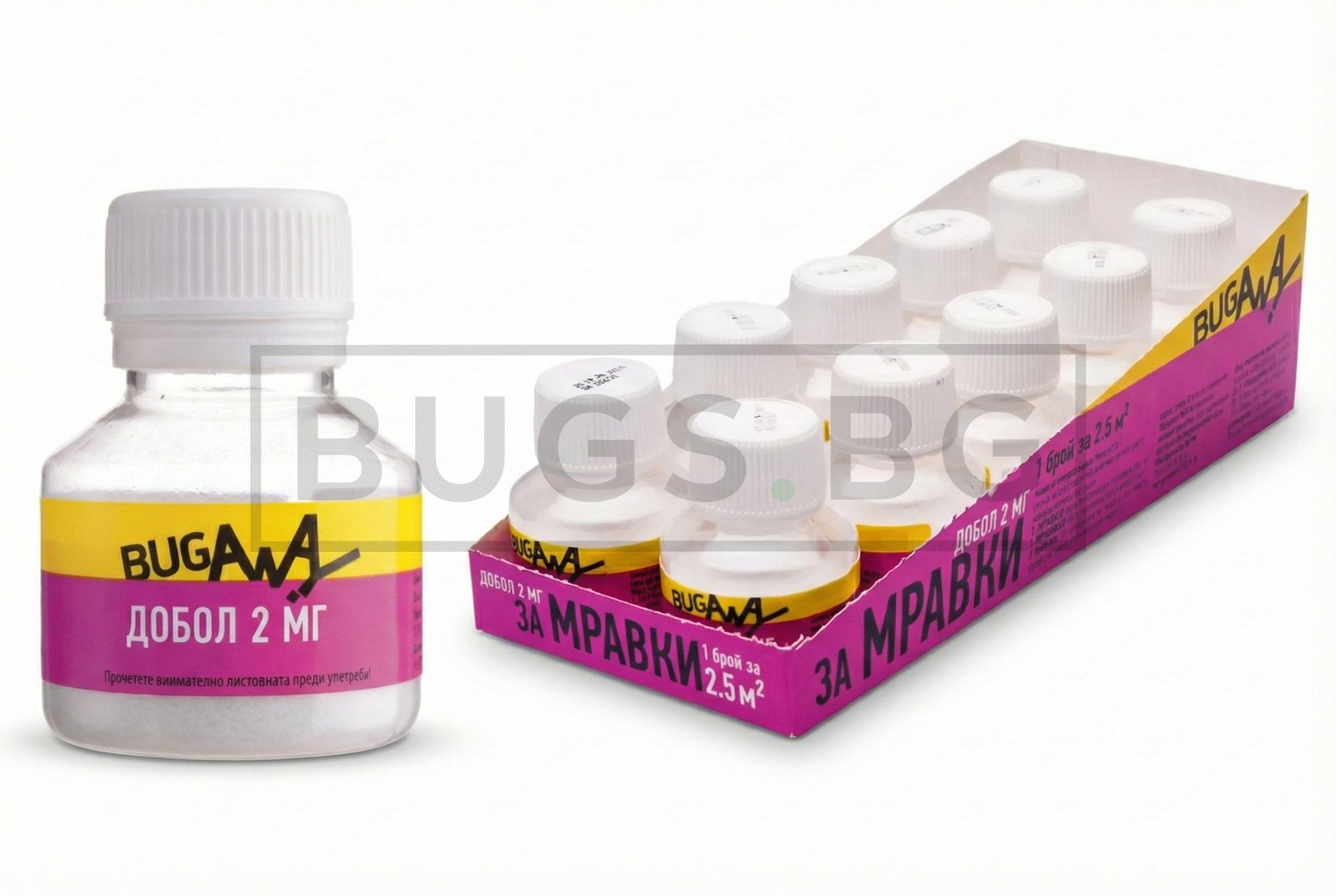 BugAway Dobol 2 MG е примамка под формата на водоразтворими микрогранули за контрол на мравки на закрито и на открито. Мравките пренасят примамката по пътечките си, което подпомага овладяването на проблема и в гнездото. Подходящ е за целенасочено третиране на активни зони.